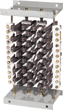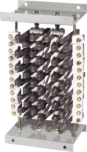 电阻器ZX12型系列系敞开式,防护等级为1P00,全系列电阻器按各种上规格分别由12、16及24片电阻元件装配而成。电阻元件为铁铬铝合金轧制成齿形,结构按其宽度分为大、中、小三种,大片与中片两端冲孔作为安装之用,小片规格的两端直接由接线板联结,电阻元件两端联结处,去除表面氧化膜以保证触良好。每一电阻元件的联结均凭借紧固镙钉压紧,以保证良