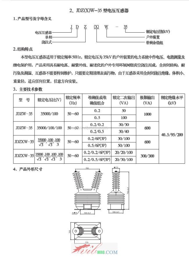 JDZW-35 35/0.1/0.1 50,60 0.2/0.2 30/30 800 40.5/95/200