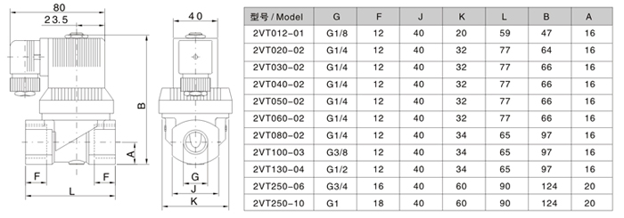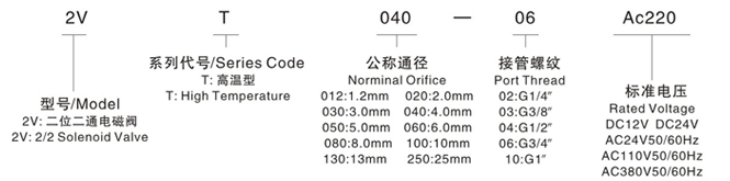 ■ 产品特点 ◆ 创新:介质温度可达到180℃ ,活塞式结构工作平稳、寿命长 ◆ 低压启动 ◆ 适用于:蒸汽空气及运动粘度≤1mm2/s的多种热介质 ◆ 密封材料无污染 ◆ 线圈:热固性塑料全包覆IP65保护制式 ◆ 更换先导头及线圈可作防爆阀用 ■ 举例 ▲ 欲订购接管螺纹为G1/4",标准电压为DC24V,公称通径为3mm,2VT系列电磁阀,其正确的订购码为:2VT030-02-DC24V | ||||||||||||||||||||||||||||||||||||||||||||||||||||||||||||||||||||||||