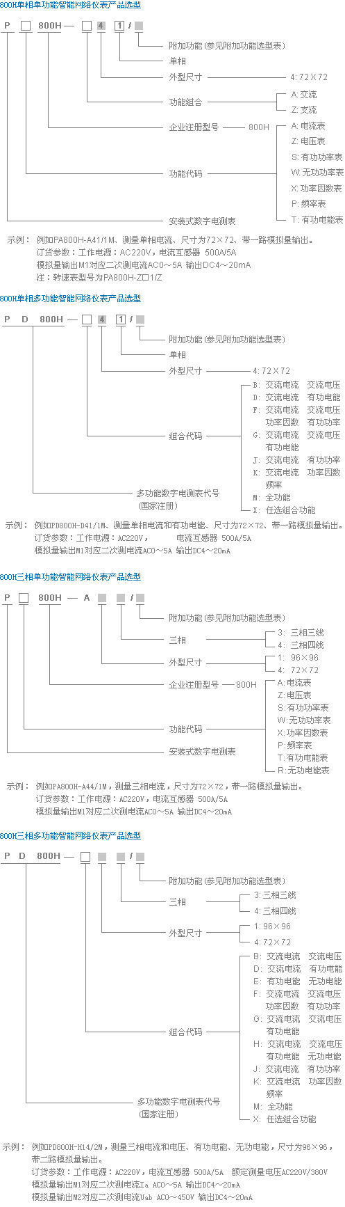 本系列仪表由800H单相仪表和800H三相仪表两大类构成,其中又按照电测功能的种类多少又各自可分为单功能电测仪表和多功能电测仪表两个子类。